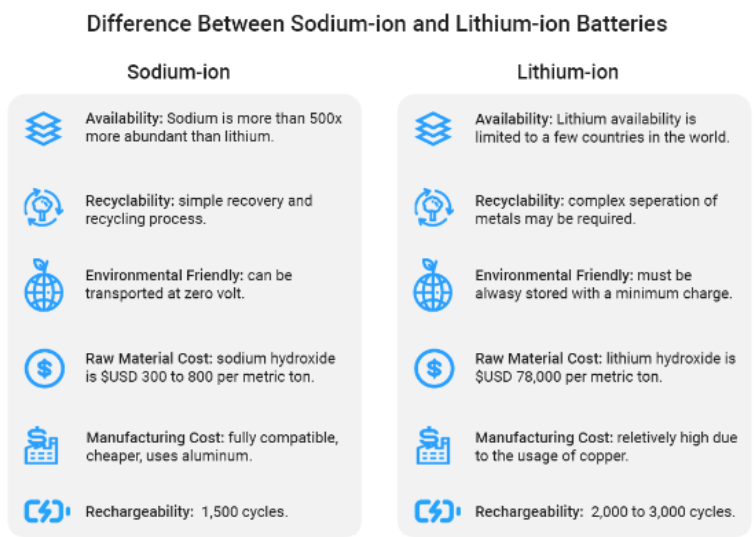 Dostupnost: Natrijum je jedan od najzastupljenijih elemenata na Zemlji, prisutan u velikim količinama u morskoj vodi. Ovo obilje čini natrijum-jonske baterije ekonomičnijim rešenjem u poređenju sa litijum-jonskim baterijama1.
